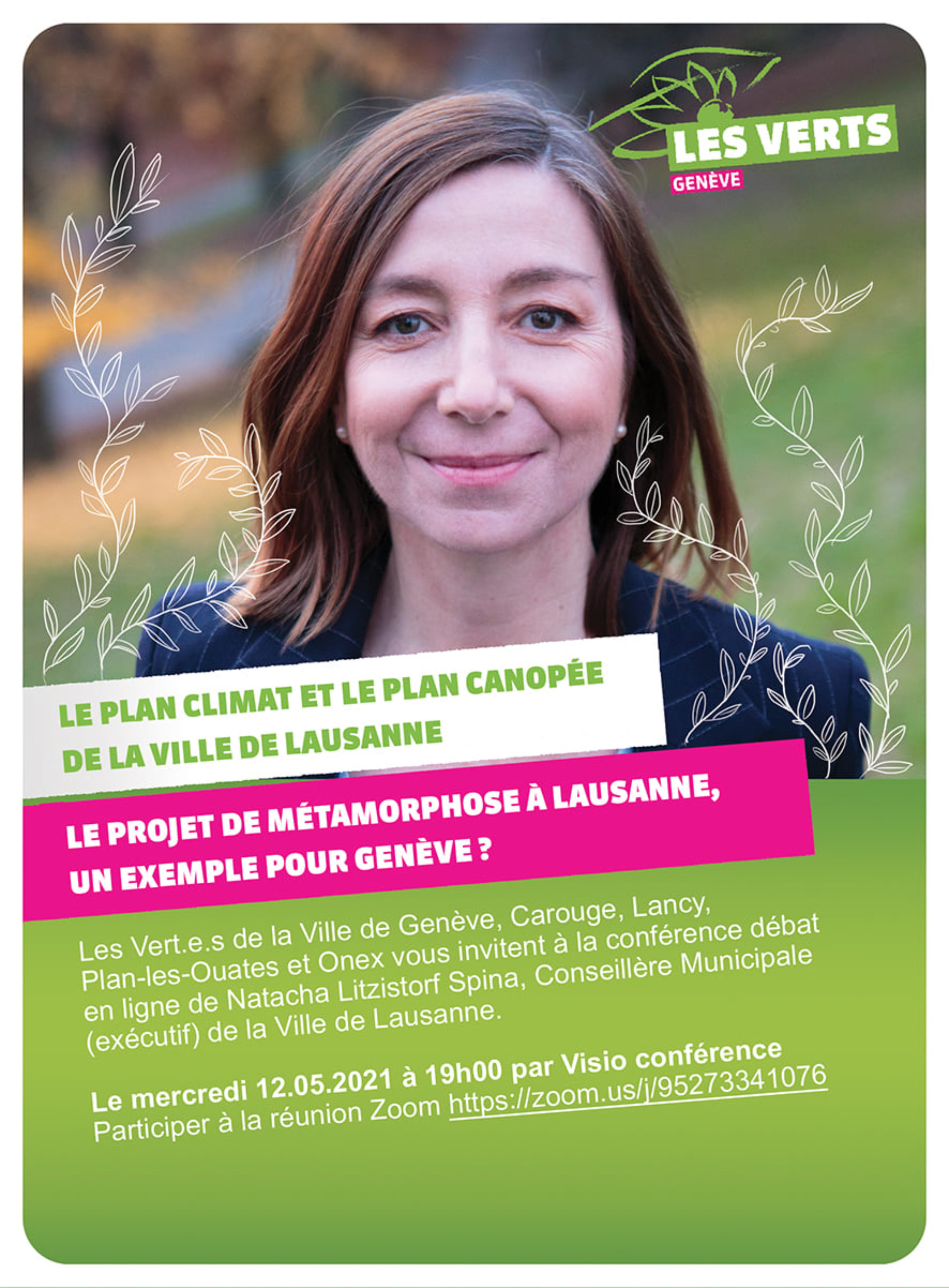 Les Vert.e.s de la Ville de Genève, Carouge, Lancy, Plan-les-Ouates et Onex vous invitent à la conférence débat en ligne de Natacha Litzistorf Spina, Conseillère Municipale (exécutif) de la Ville de Lausanne.
